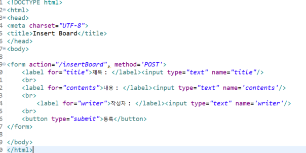 src/main/resourecs하위에 templates 폴더에 insertBoard.html을 생성 후 다음과 같이 작성합니다.